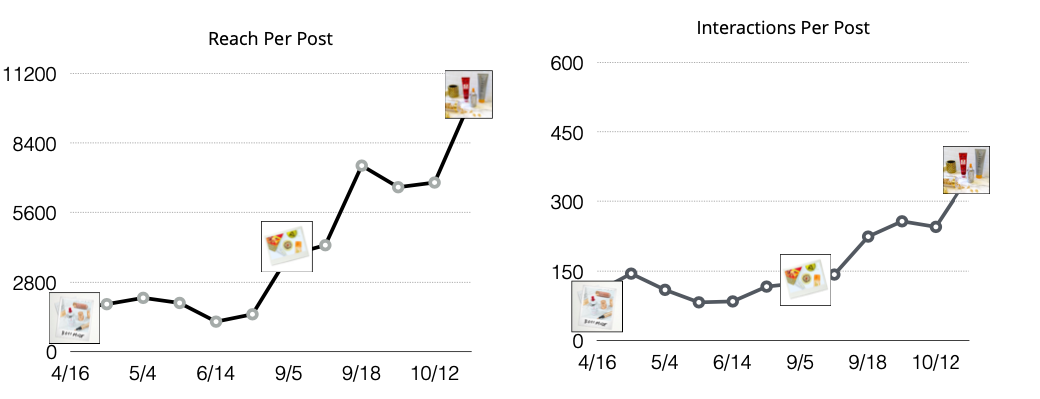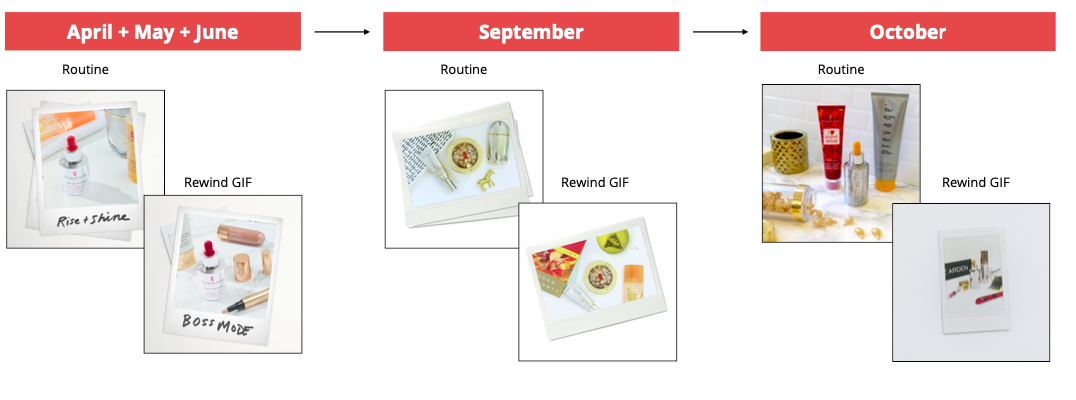 Throughout the partnership, I monitored content performance and made creative optimizations to drive better results. As an example, the creative execution of the routine rewind content pillar evolved over time to respond to fan feedback. Eliminating the polaroid style creative in our routine assets, and reserving that only for the animated rewind of each month’s routines, resulted in these posts earning a higher reach and garnering more interactions than the content from previous months.
